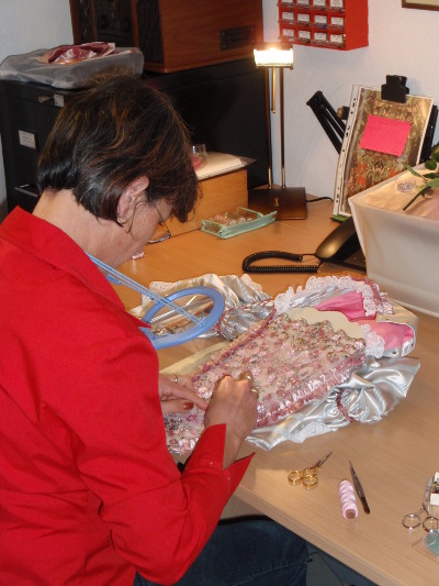 Hier entsteht ein reichlich mit Perlen bestickter Bruststecker einer Rokokogarderobe. Geduld und Zeit müssen reichlich vorhanden sein.